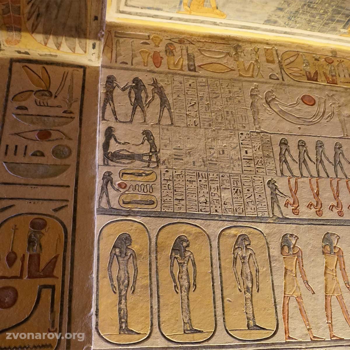 На стенах коридоров и залов вы увидите целые «комиксы» из сцен с богами, лодками, звёздными сводами, змеями и фигурами людей в странных позах. Официальная египтология объясняет эти изображения как визуальные руководства по загробному миру: божества сопровождают душу правителя, тексты и символы описывают пути солнца и трансформацию человека после смерти. Многие сюжеты взяты из таких текстов, как «Книга врат» или «Книга мёртвых», но в каждой гробнице они скомпонованы по-своему.
