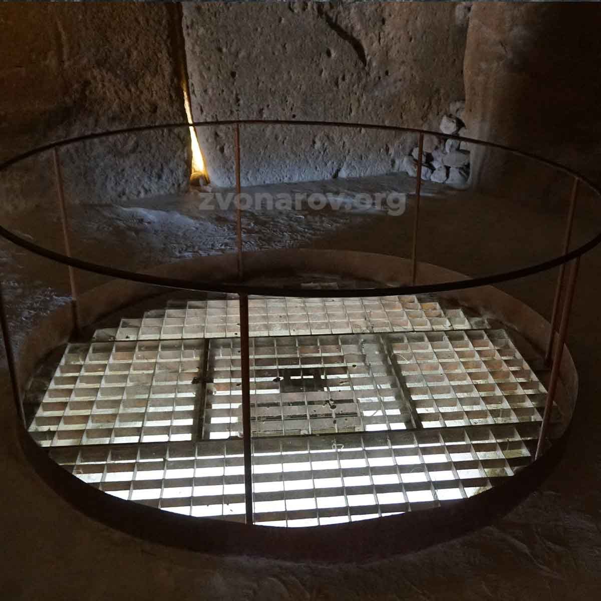 Особое внимание привлекает глубокий колодец, вырубленный в полу у задней стены камеры. Его диаметр около полутора метров, а глубина достигает почти 20 метров — это эквивалент высоты восьмиэтажного здания. Колодец доходит до уровня грунтовых вод и был полностью исследован в 2005 году. Учёные не пришли к единому мнению о его предназначении. Существуют две основные версии: