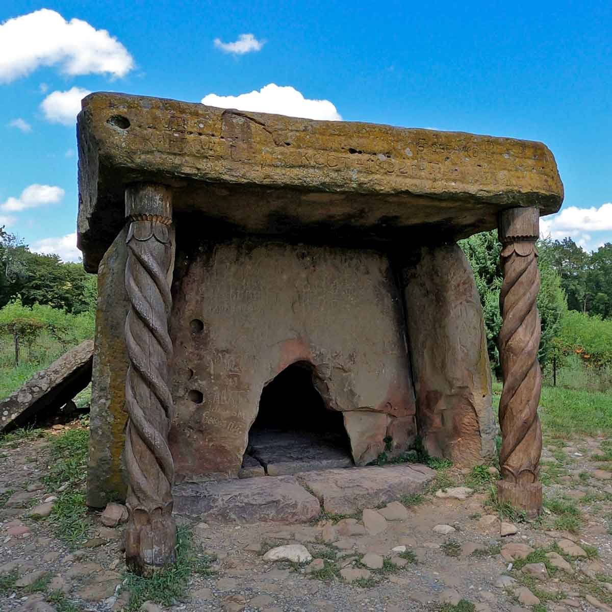 Знакомьтесь, друзья — дольмен Тор. Это был первый дольмен, который я увидел в Краснодарском крае, и он произвёл на меня сильное впечатление. Посмотрите, насколько он массивный: сооружение выполнено из больших цельных каменных плит. Я могу стоять внутри этого дольмена почти в полный рост. На фоне леса и синего неба он выглядит особенно необычно. Если бы я увидел его здесь 200 лет назад, то наверняка подумал бы, что такое сооружение местные жители построить не могли, ведь в этой местности и домов-то качественных почти не было, не говоря уже о таких плитах перекрытия, какие мы видим в этом дольмене.