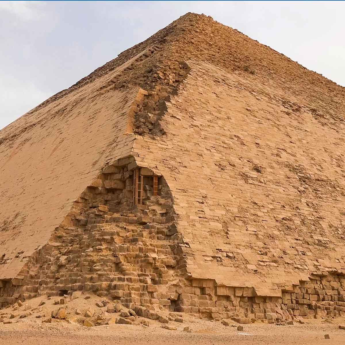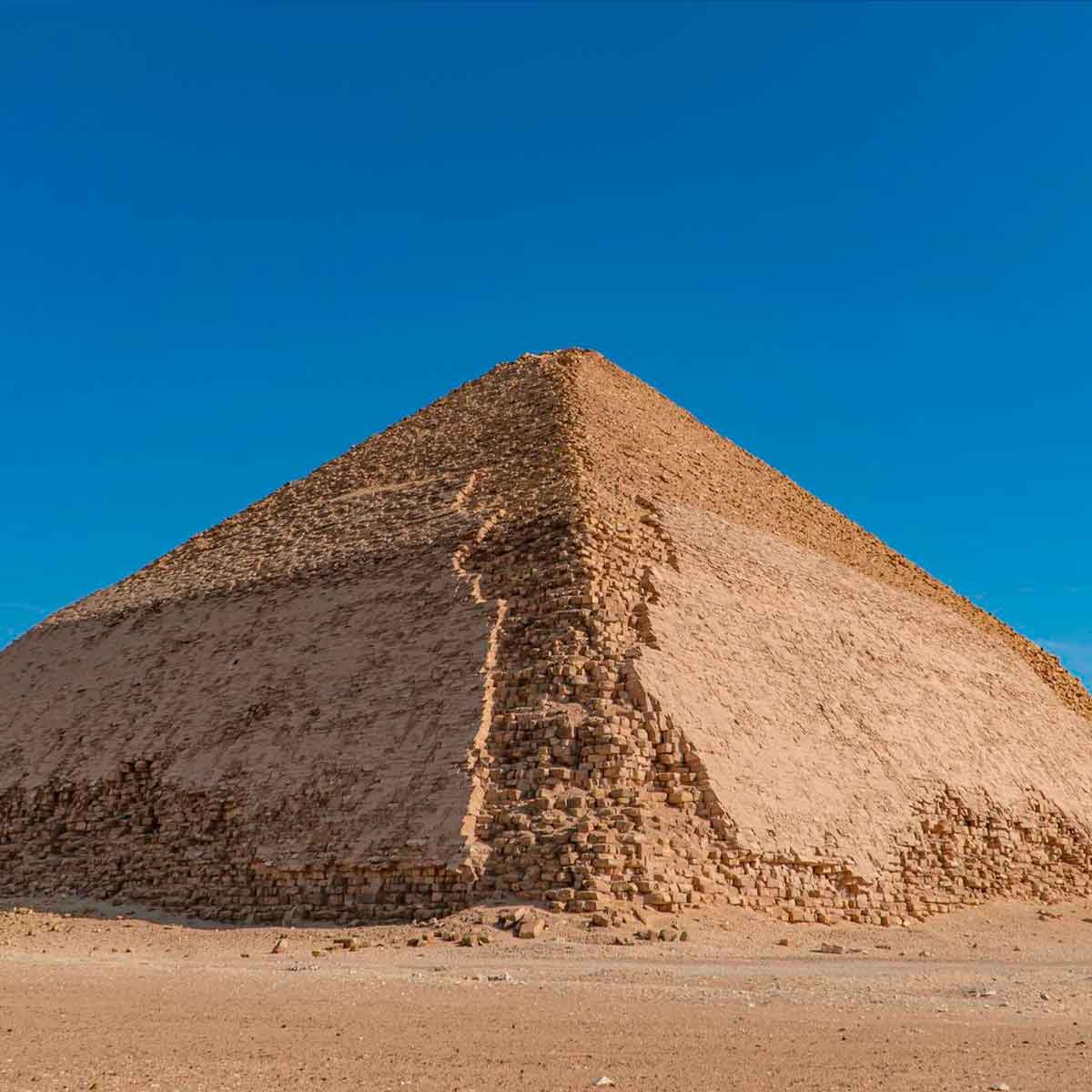 Ломаная пирамида в Дахшуре — одно из самых загадочных сооружений Древнего Египта. Она возвышается над пустыней на юг от Каира и сразу выделяется своей необычной формой: её грани меняют угол наклона на половине высоты, словно пирамида согнулась в процессе строительства. Высота памятника превышает 100 метров, а основание достигает почти 190 метров. Сооружение облицовано светлым известняком, часть которого сохранилась до наших дней, благодаря чему именно эта пирамида лучше других передаёт представление о том, как выглядели древние монументы в эпоху своего расцвета.