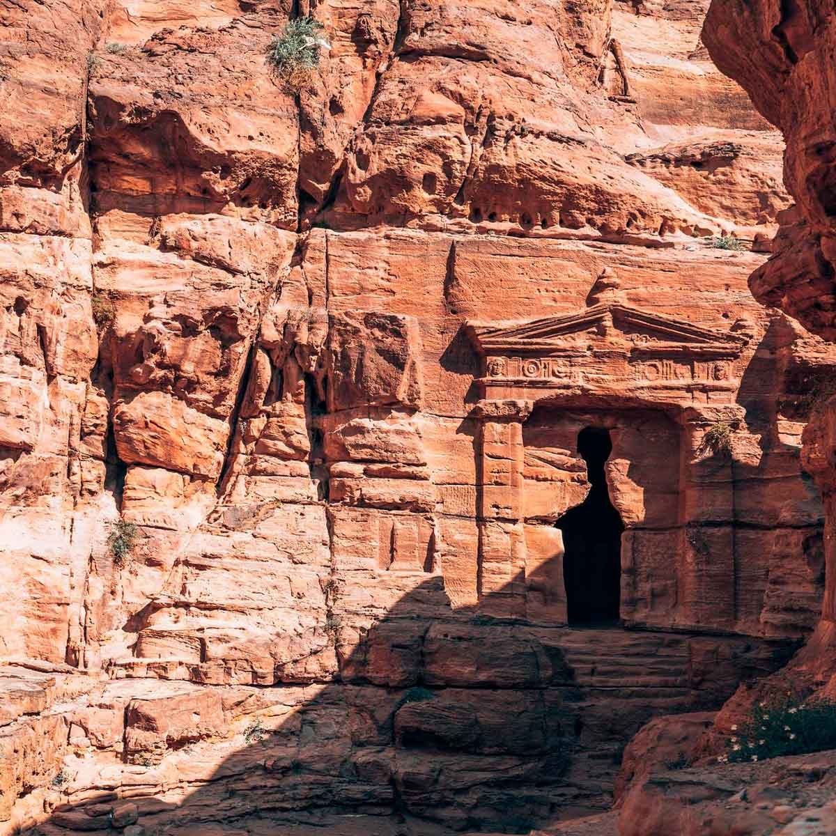 Львиный триклиний — Очередная достопримечательность Петры кажется выполненной более грубо и небрежно на первый взгляд. Однако перед нами вновь монолитное творение: фасад и внутреннее помещение высечены в цельной скале. Трудно представить, какое назначение имело это место, ведь доступ к нему не самый удобный. Ещё один вопрос вызывает его нынешний вид — повсюду заметны следы разрушений, а местами создаётся впечатление, что сооружение так и не было завершено.