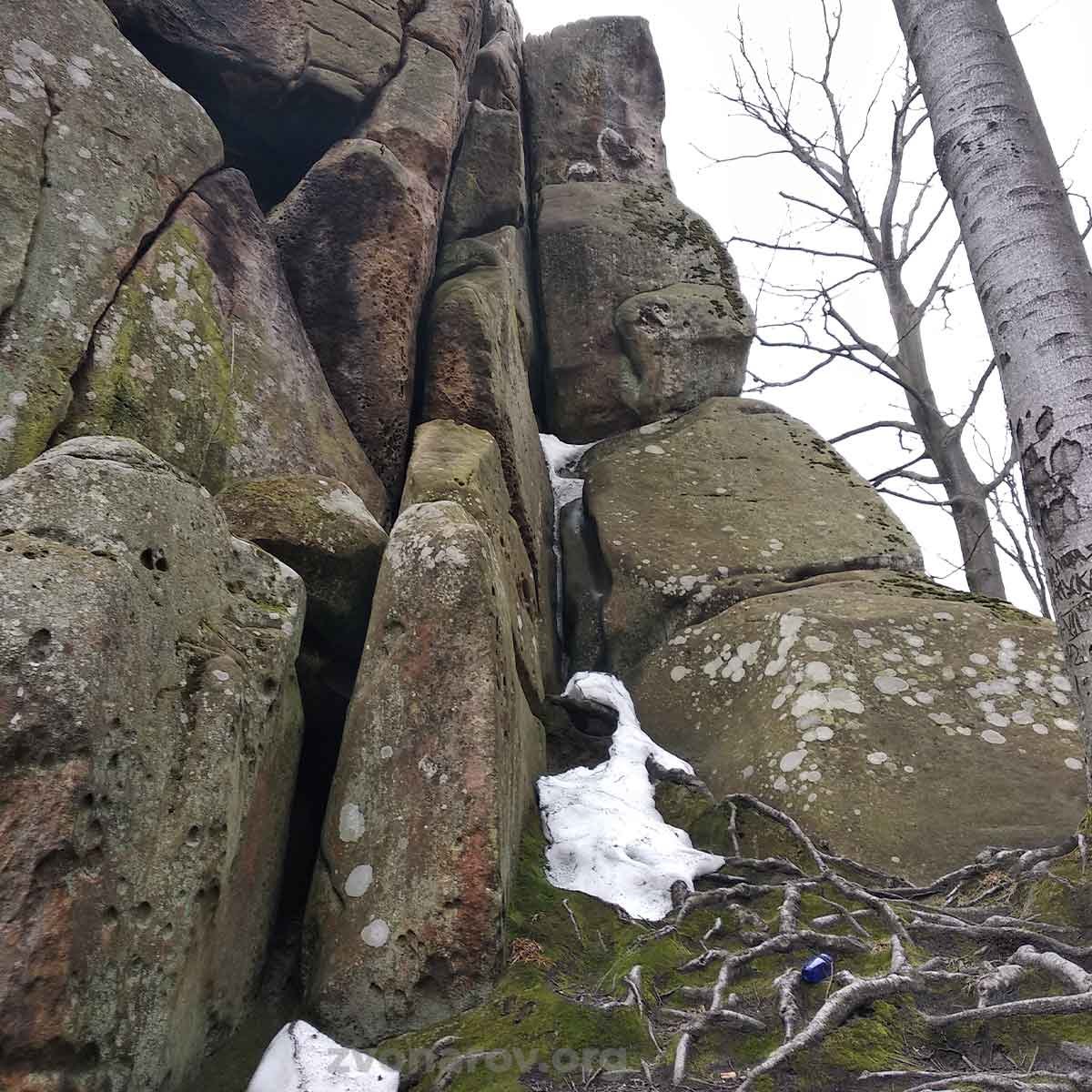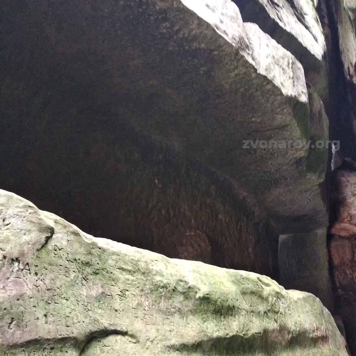 Я неоднократно слышал, как это место называют дольменом. Но нет, это не дольмен, это не имеет ничего общего с дольменом. Однако происхождение этой структуры остаётся загадкой, и это очень интересно. Потому что, хоть человек и приложил руку к вырубанию кусков скалы, чтобы адаптировать это место под свои нужды, тем не менее я считаю, что здесь изначально уже были выемки, которые люди просто расширили, чтобы использовать в своих целях во времена Довбуша и задолго до него...