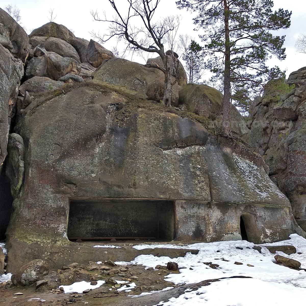 И да, к изменению этого скального комплекса действительно приложил руку человек, потому что некоторые камеры использовались как тюрьма какое-то время, а в некоторых выемках хранилась вода. Кое-где в скалах пробиты ступеньки, видно, что небрежно киркой обработаны скалы — просто для удобства, для того чтобы зимой не скользить и не падать, потому что люди использовали эту местность как естественное убежище.